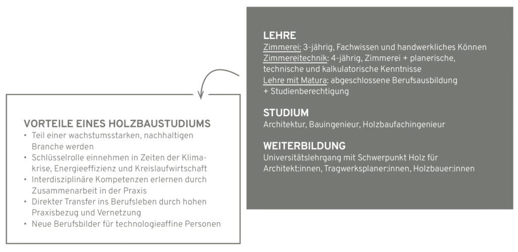 Die Holzwirtschaft besteht aus der Industrie, den Handwerksbetrieben und den Planenden. Dementsprechend gibt es verschiedene Wege der Fortbildung. Wer sich fürs Handwerk entscheidet, kann den klassischen Weg der dreijährigen Lehre wählen oder diese auch mit einer weiterführenden Ausbildung kombinieren. Wen es mehr Richtung Planung zieht, dem stehen neben den klassischen Berufsbildern wie Architekt:in oder Bauingenieur:in auch der/die in den letzten Jahren etablierte, sogenannte Holzbaufachingenieur:in zur Verfügung. Er/sie arbeitet an der Schnittstelle zwischen Architektur, Fachwerksplanung und ausführenden Firmen mit dem Ziel, eine Wissenslücke zu schließen.