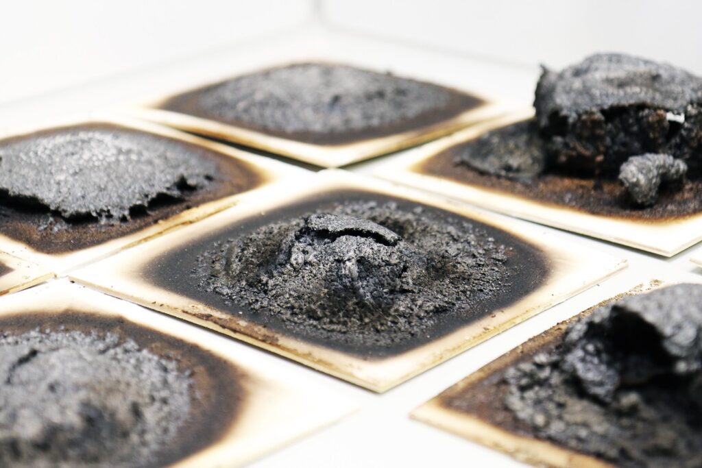 Am DTNW wurden verschiedene Flammschutzmittel synthetisiert und am Fraunhofer WKI in eine intumeszierende Beschichtung einformuliert. Die Forschenden ermittelten vier vielversprechende Formulierungen. Diese wurden für Untersuchungen im Brandschacht, im Cone-Kalorimeter sowie unter natürlicher Bewitterung verwendet. Zwei der Beschichtungen bestanden aus einer klassischen intumeszierenden Mischung und einem Bindemittel. Die anderen beiden Formulierungen enthielten zusätzlich neu synthetisierte Flammschutzmittel.