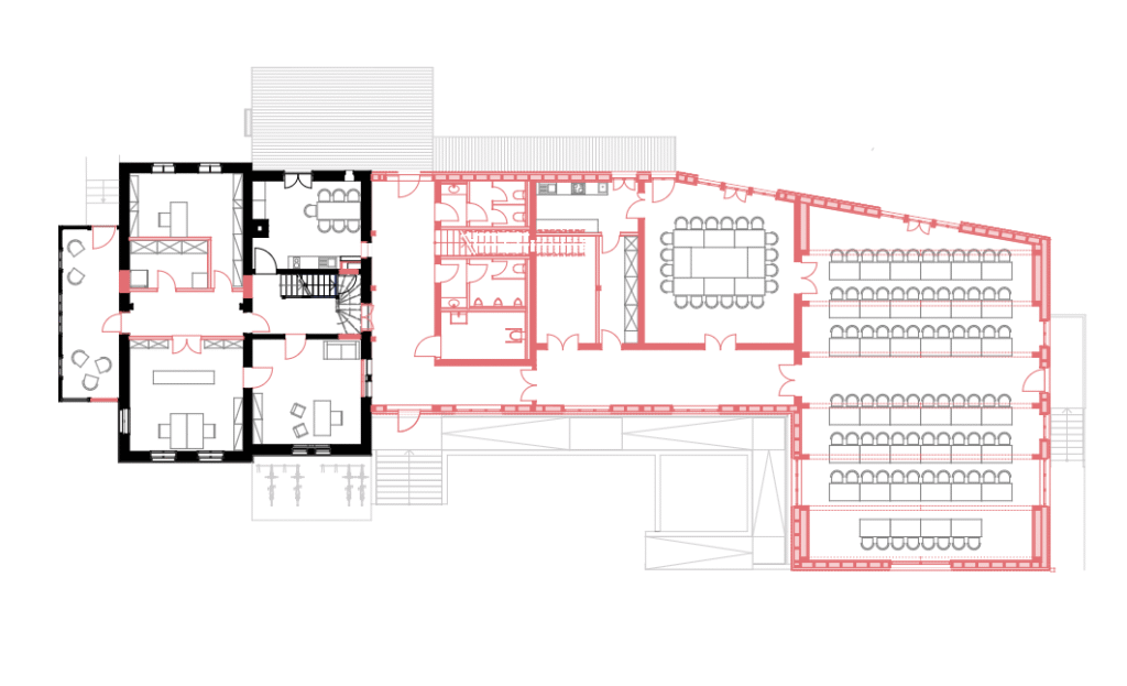 Der Neubau besteht aus zwei Teilen: einem Saalbau in reiner Holzrahmenbauweise und einem Verbindungsbau in Hybridbauweise, der den Übergang zum Massivbau des Bestands schafft. Die Fassadenbekleidung ist als hinterlüftete Konstruktion ausgeführt und mit vertikaler Lärchenholz-Bretterschalung in variierenden Breiten gestaltet. Diese Lösung sorgt nicht nur für eine lebendige Optik, sondern erfüllt auch bauphysikalische Anforderungen an Feuchteschutz und Dauerhaftigkeit.
