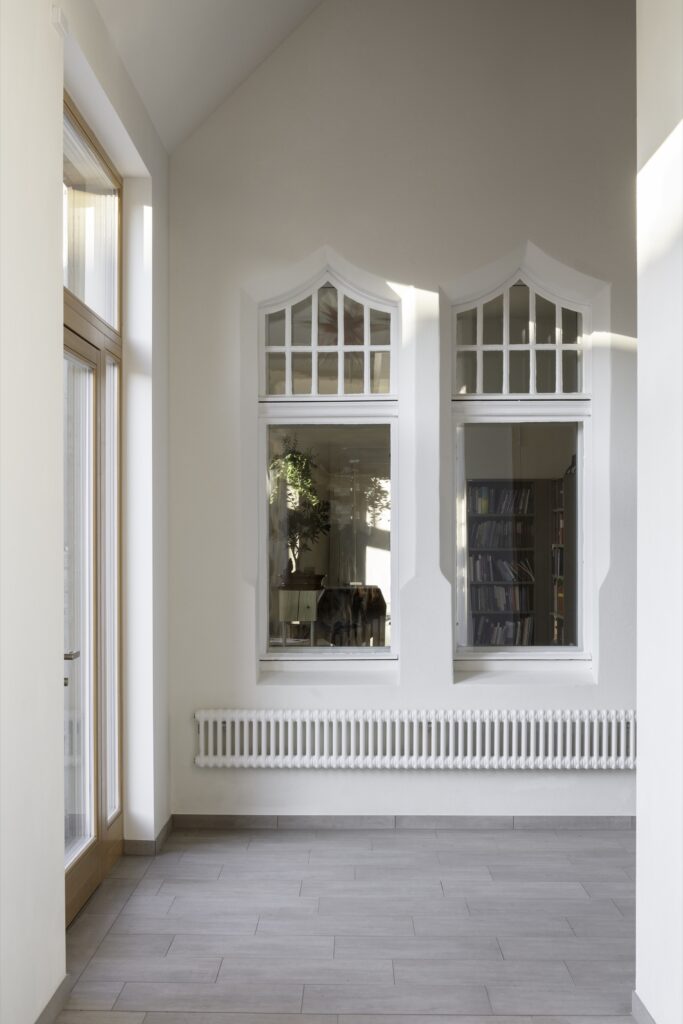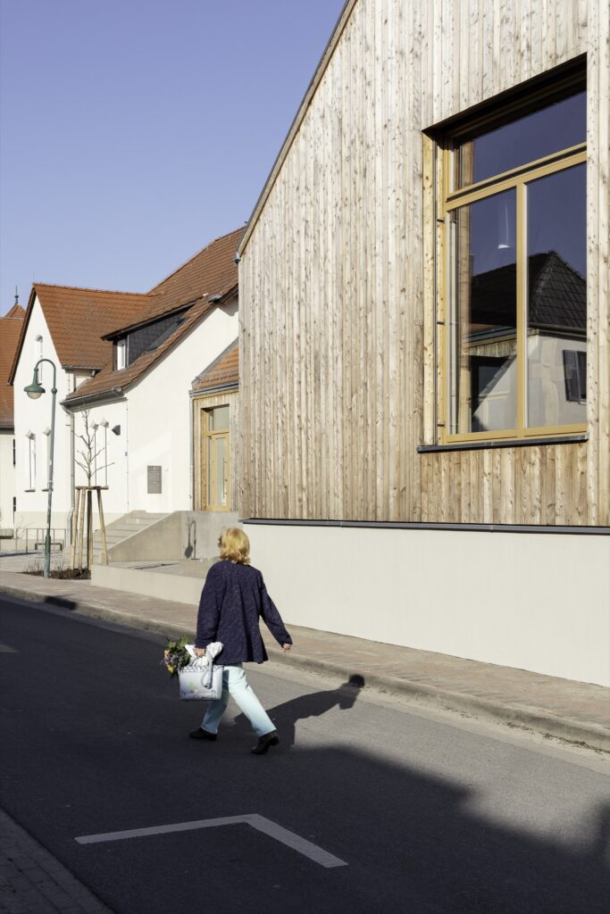 Die L-förmige Anordnung der Baukörper schafft einen gefassten Vorplatz, der als Treffpunkt dient und den Gedanken eines „Hauses für alle“ unterstützt. Die barrierefreie Erschließung und die Gestaltung der Außenanlagen – mit einer Holzterrasse und historischen Ziegelpflasterflächen – setzen den Dialog zwischen Alt und Neu fort. Bemerkenswert ist die konsequente Einbindung regionaler Unternehmen: Alle planenden und ausführenden Firmen stammen aus Berlin-Brandenburg.