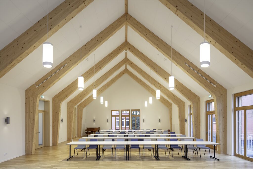 Im Inneren prägt Holz die Atmosphäre: Der Saal ist durch eine offene Tragstruktur aus Brettschichtholzrahmen gegliedert, die nicht nur statische Funktionen übernimmt, sondern auch den sakral anmutenden Charakter des Raumes unterstreicht. Die Konstruktion erlaubt flexible Möblierung, sodass der Raum für Synoden, Konzerte oder Tagungen genutzt werden kann.