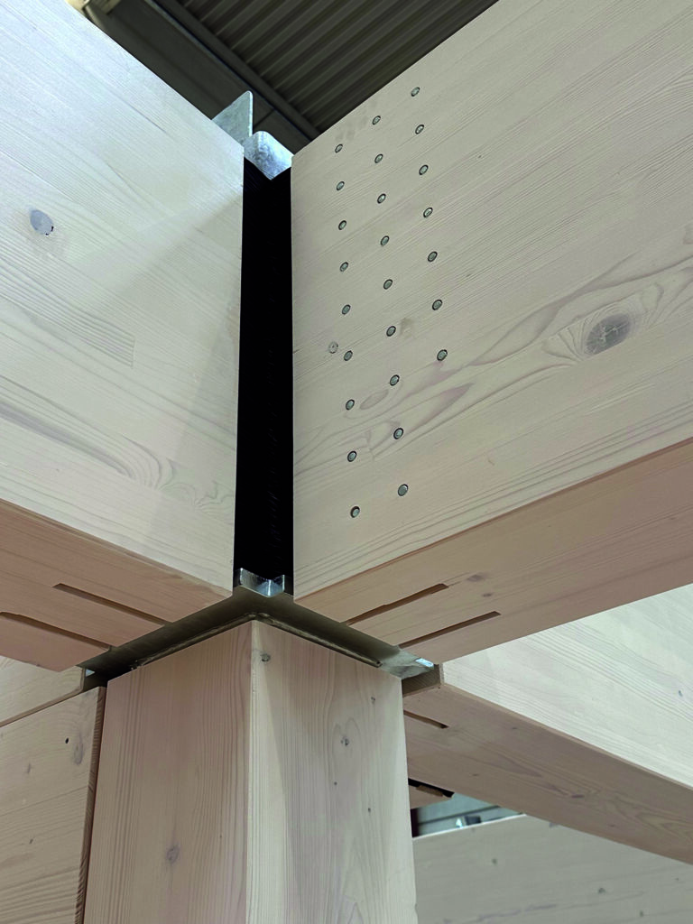 Die Hauptknoten des Gebäudetragwerks wurden eigens für dieses Projekt konzipiert, und die Knoten der Nebenträger sowie die Fassadenelemente so gestaltet, dass sie sich mit wenigen Handgriffen montieren lassen. „Um das möglich zu machen, haben wir im Vorfeld intensiv das Marktangebot an Verbindern geprüft – und letztlich jene gewählt, die sich am einfachsten wieder lösen lassen“, erinnert sich Tragwerksplaner Kurt Pock, Geschäftsführer der KPZT Kurt Pock, der die statische Berechnung des Projekts übernahm. Zum Einsatz kommen spezielle Knapp Verbinder, die eine einfache, schnelle und sichere Montage garantieren und dank ausreichender Einbautoleranzen auch eine flexible Standortanpassung erlauben. Insgesamt wurden 100 Garnituren Ricon S 290/80 VS, 270 Garnituren Walco V80, 28 Garnituren Ricon S 200/80 VS und 25 Garnituren Walco V89 mit Langloch verbaut – zur Verbindung von Holz mit Holz bzw. Holz mit Stahl und sowie zur Montage der Fassadenelemente. Im aufgebauten Zustand verdeckt eine Verkleidung mit schwarzen Bürsten die technisch markanten Verbinderdetails– für die Gäste der Red Bull Energy Station bleiben diese somit vollständig unsichtbar.